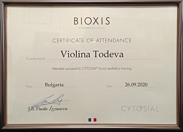 Сертификат за работа с дермален филър Cytosial 2020 г.