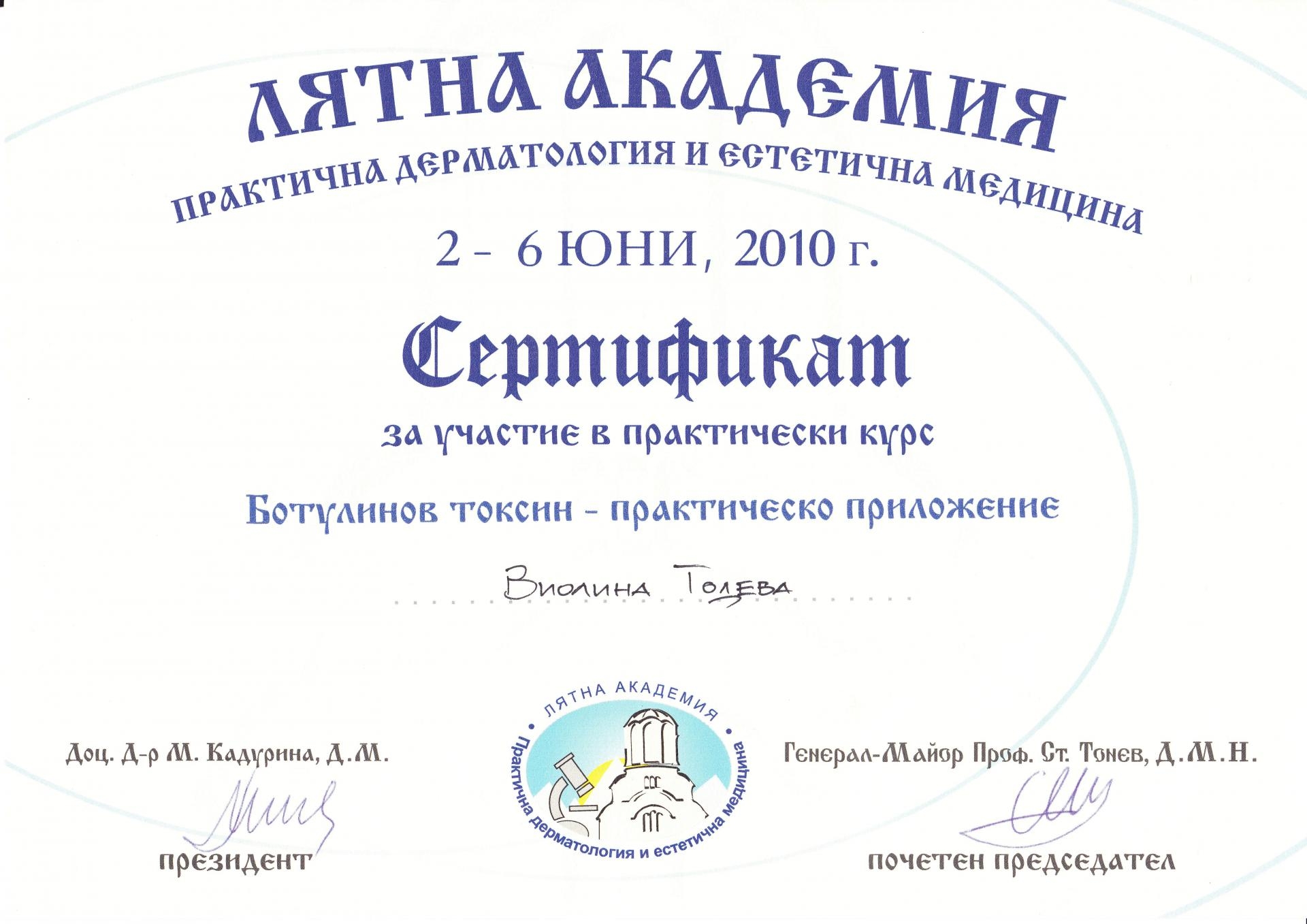 Сертификат ботулинов токсин Юни 2010 г.