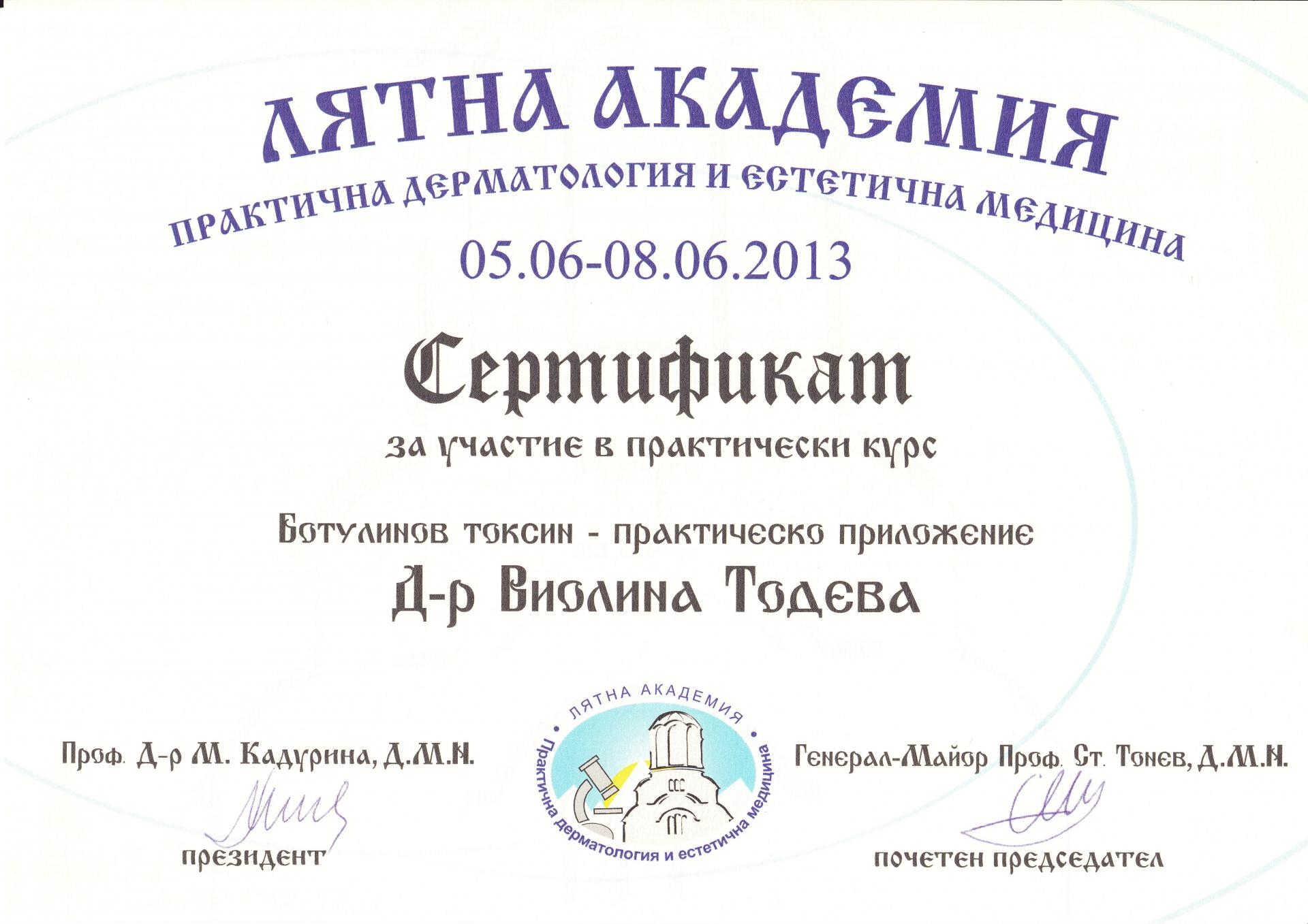 Сертификат ботулинов токсин Юни 2013 г.