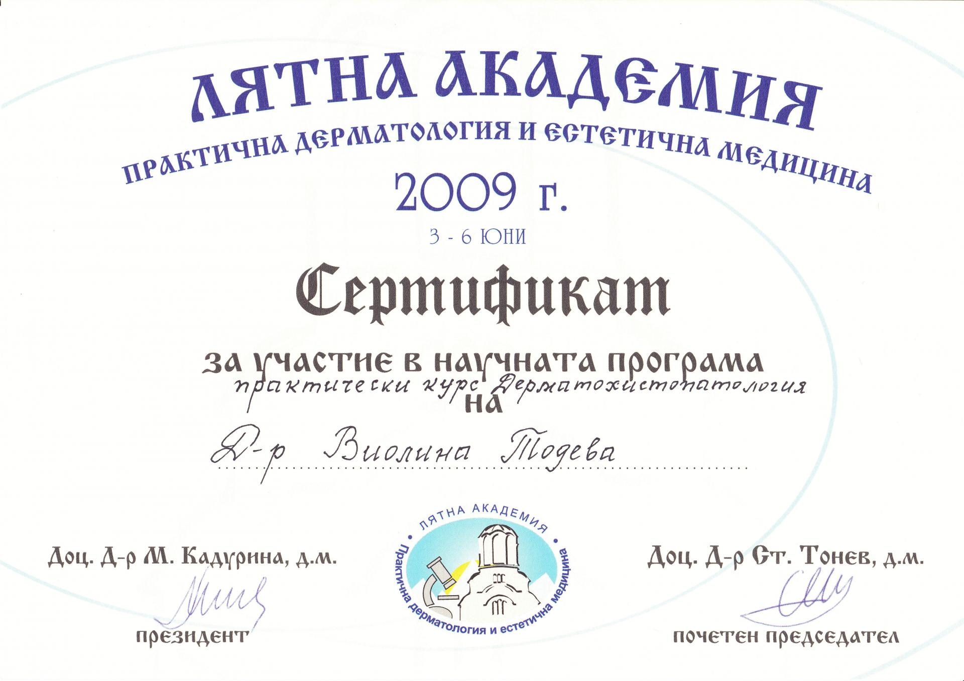 Сертификат дерматохистопатология Юни 2009 г.