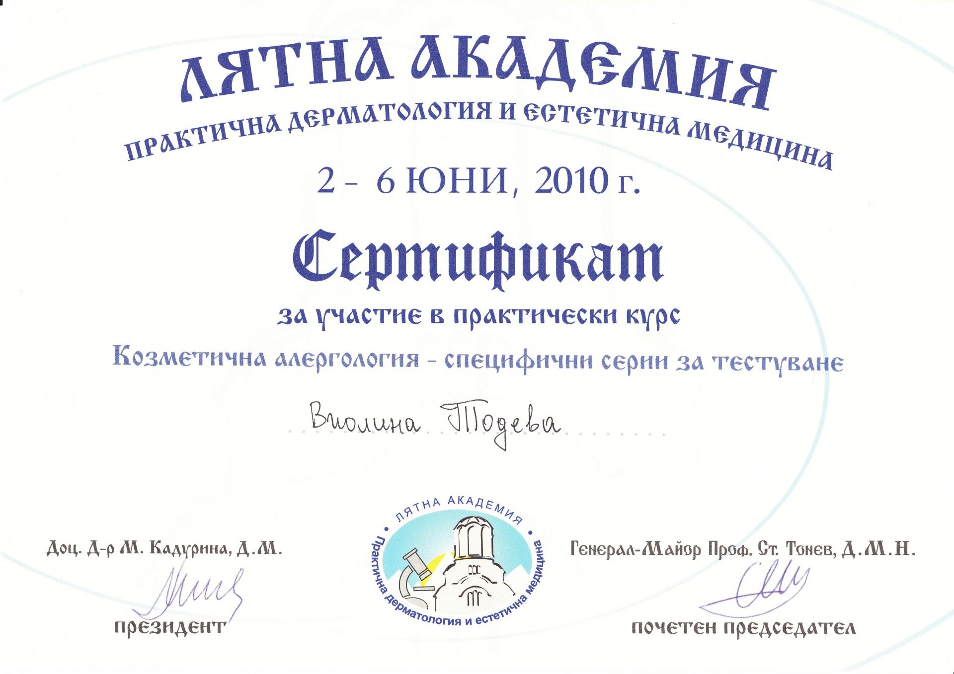 Сертификат алергологично тестуване Юни 2010 г.