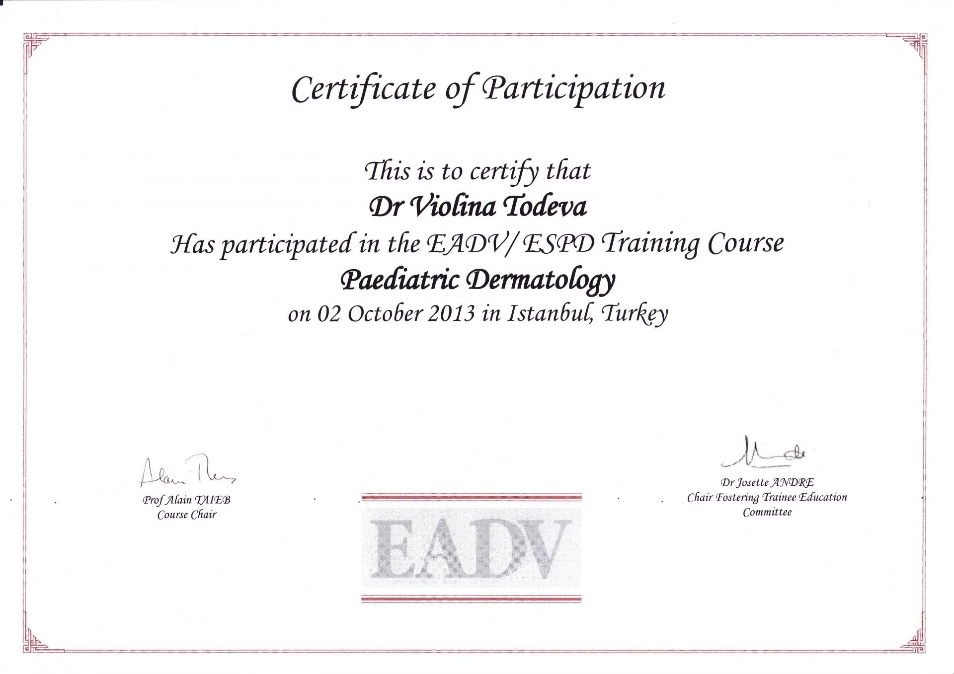 Сертификат педиатрична дерматология Октомври 2013 г.