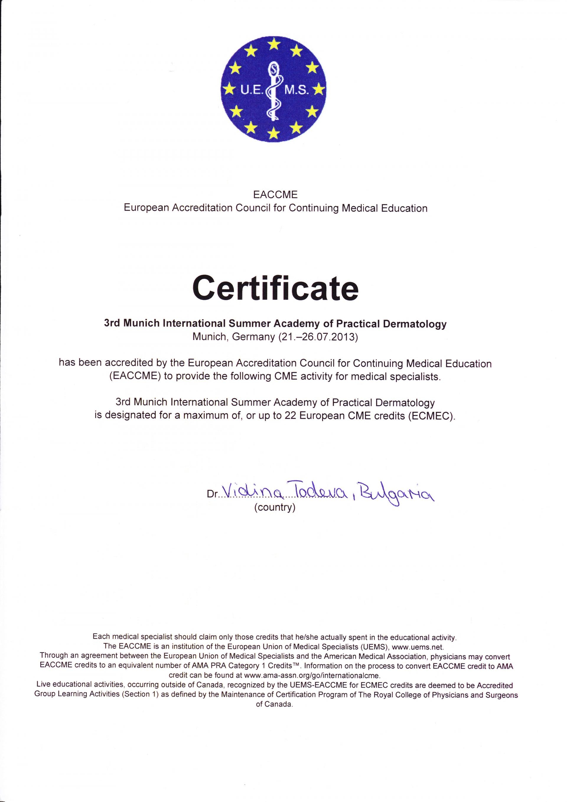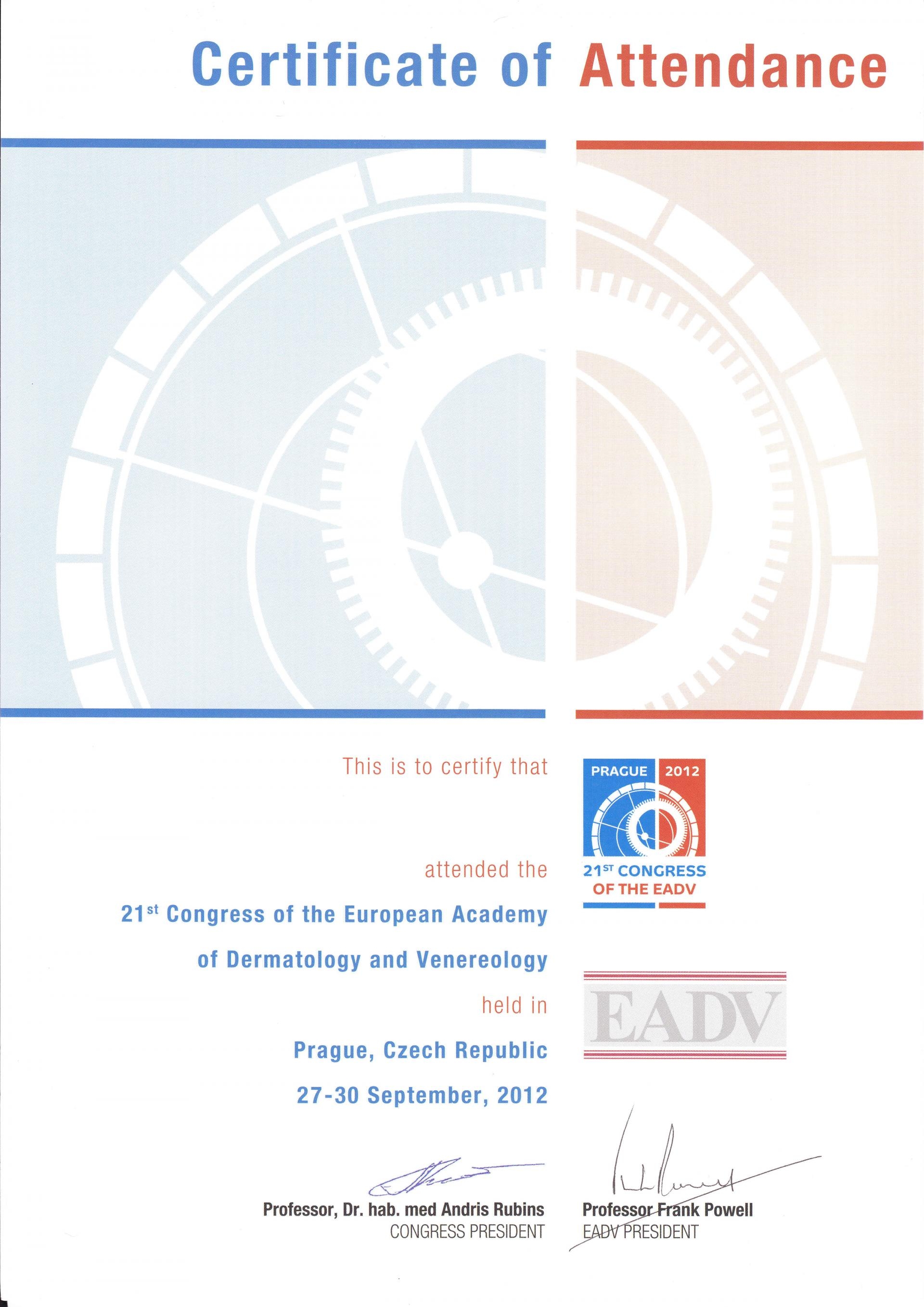 Сертификат Европейска Академия по Дерматология и Венерология Септември 2012 г, Прага