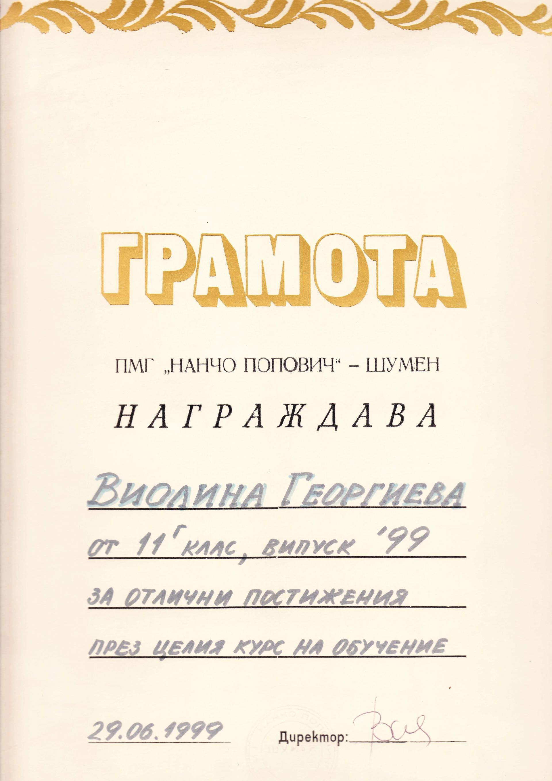 Грамота за отлични постижения - ПМГ "Н. Попович" гр. Шумен Юни 1999 г.
